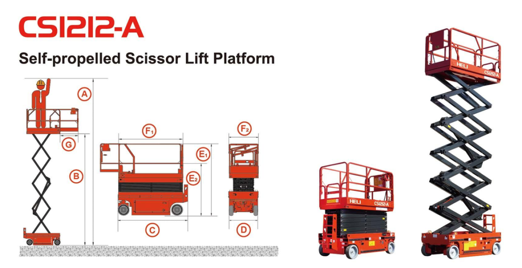 Model CSI1212-A thuộc dòng Self-Propelled Scissor Lift Platform, có khả năng tự di chuyển khi nâng, giúp người vận hành làm việc linh hoạt mà không cần di chuyển thủ công.